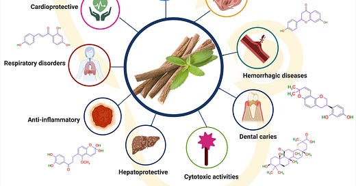 More recent tests show licorice contains more than 20 triterpenoids (such as glycyrrhizin) and nearly 300 flavonoids that contribute to its biological activity as antiviral/antimicrobial, anti-inflammatory and antitumor. While glycyrrhizin is a key component, it can also cause side effects like high blood pressure when consumed in large amounts.